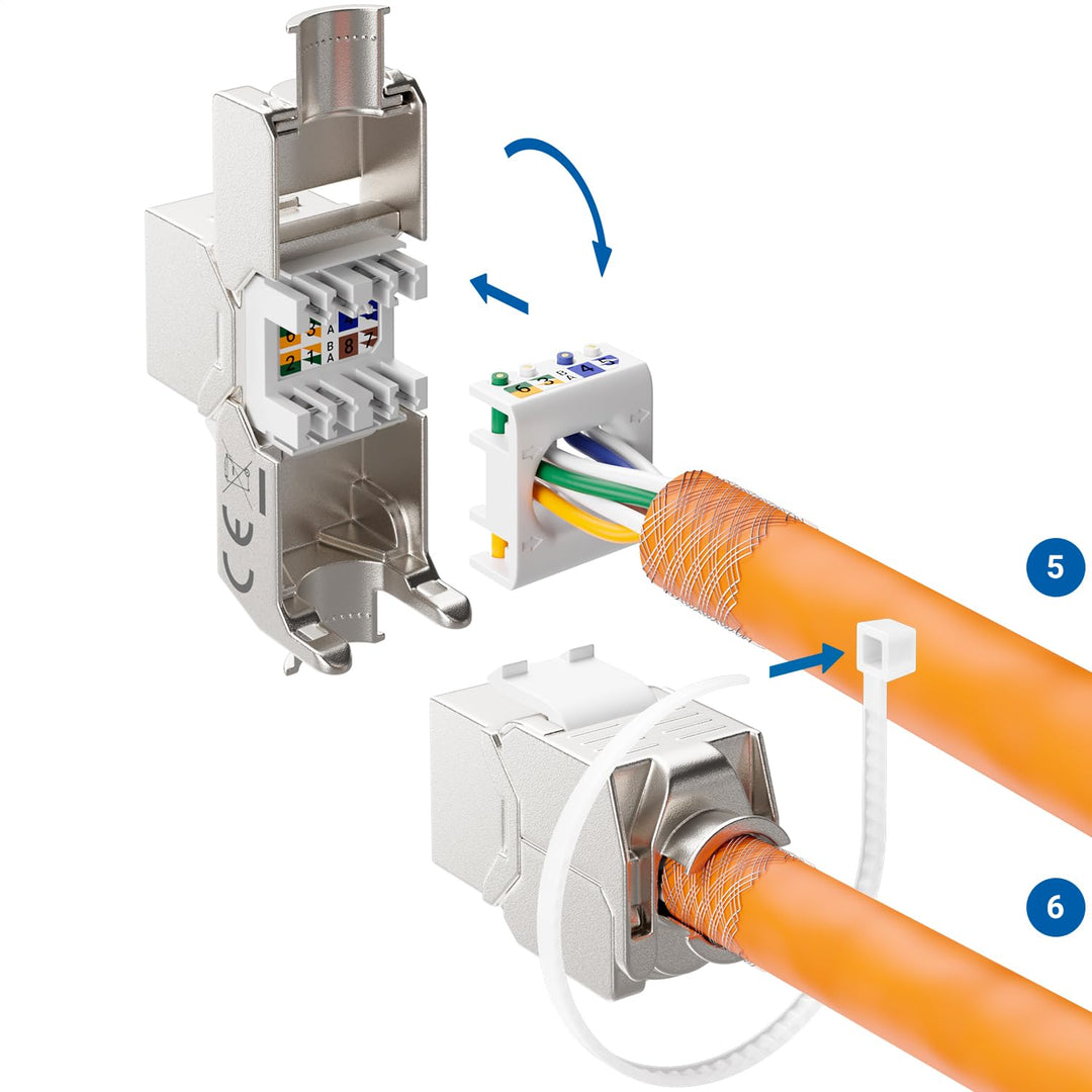 - Anschluss Rückseite Keystone Module: LSA Schneidklemme 8-polig für starre Verlegekabel // Aderaufnahme: Massivleiter / Vollleiter AWG 22-25 // Farbmakierung für TIA568A + TIA568B