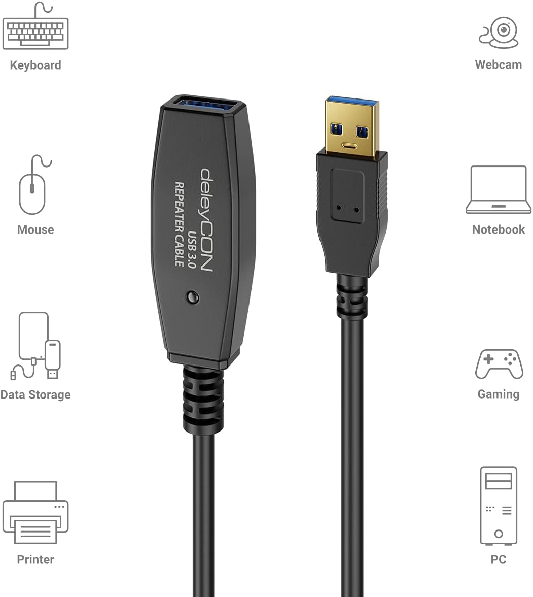- deleyCON Aktives USB3.0 Kabel + Netzteil für die Stromversorgung // Aktive USB Verlängerung Verlängerungskabel mit max. 5 GBit/s (USB 3.0 Superspeed)