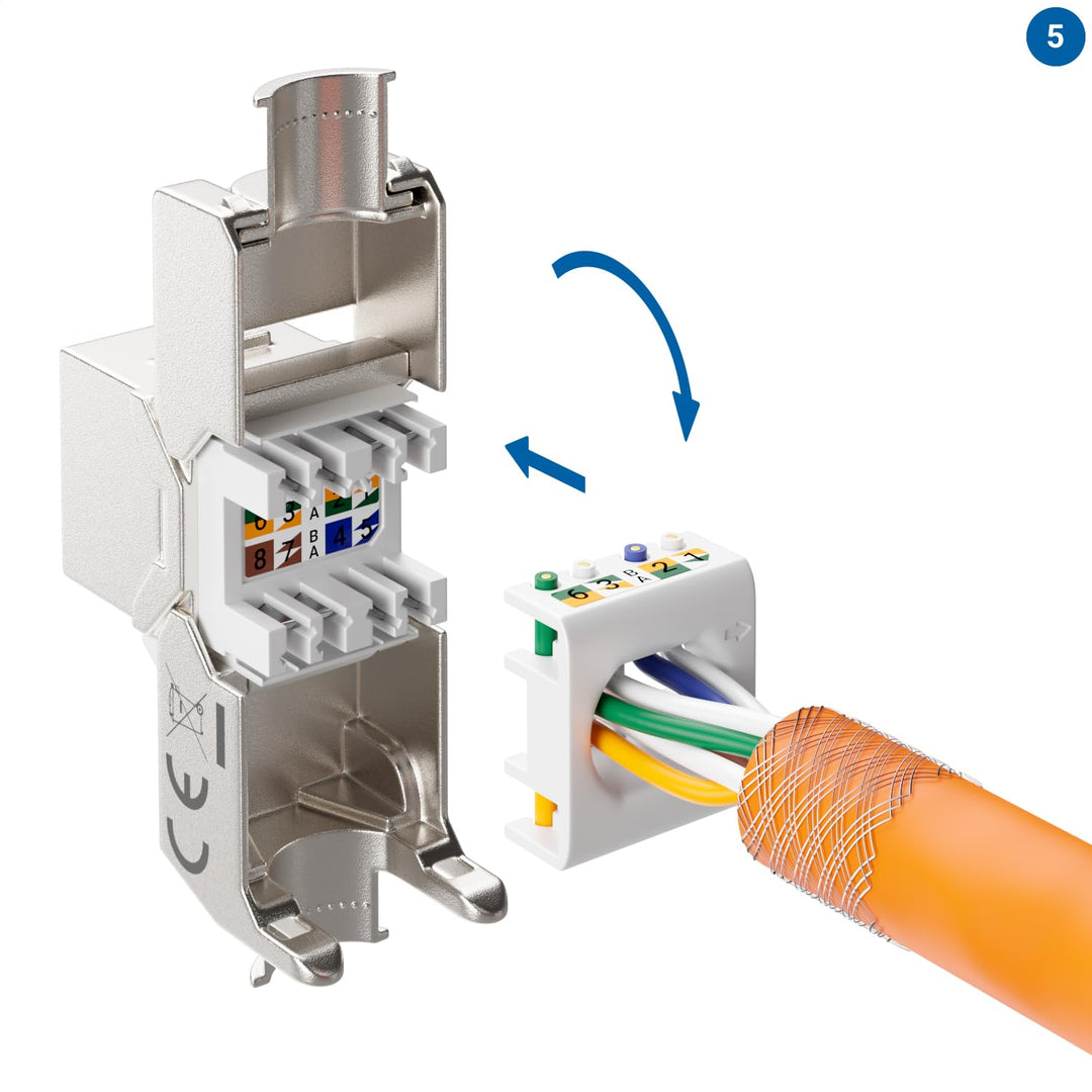 - Anschlüsse: 1x RJ45 Buchse + 1x LSA Schneidklemme 8-polig für starre Verlegekabel // Aderaufnahme: Massivleiter / Vollleiter AWG 22-25 // STP geschirmt