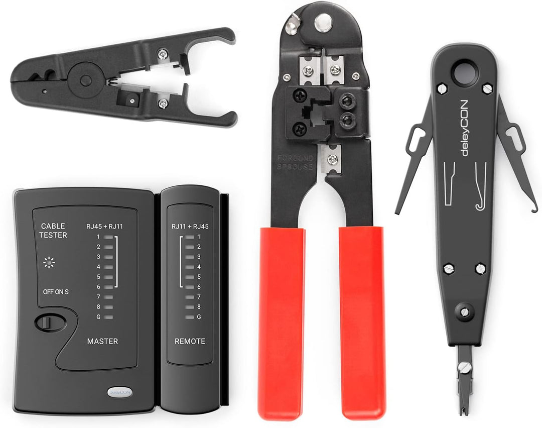 - deleyCON Netzwerk Werkzeug Set 4-teilig // Für RJ11 + RJ12 + RJ45 Netzwerkkabel und Telefonleitungen