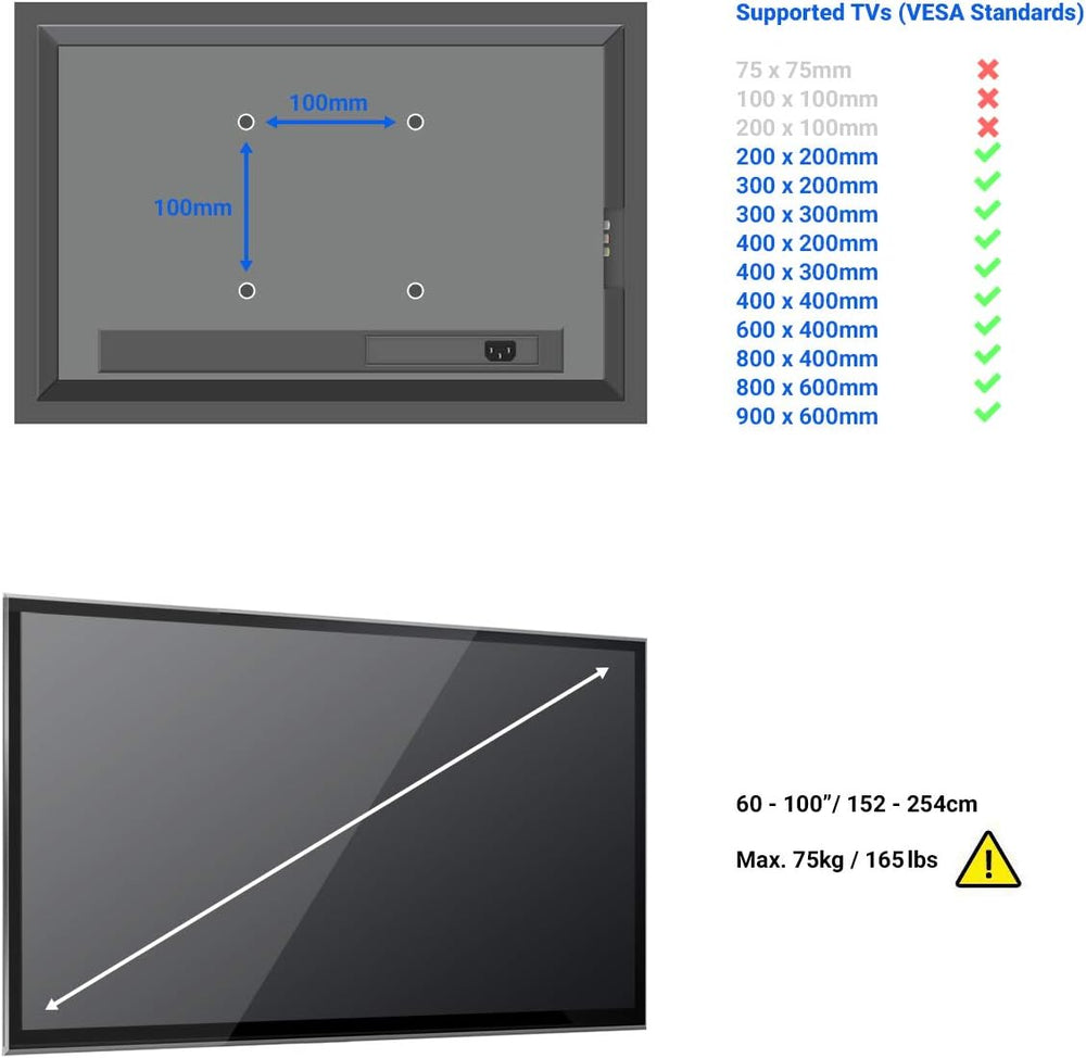 - Von 60" - 100" Zoll oder 152cm - 254cm // Neigbar von + 5° Grad bis -10° Grad // Wandabstand 8,5 cm // Bis VESA: 900x600mm // Maximales Gewicht von 75Kg