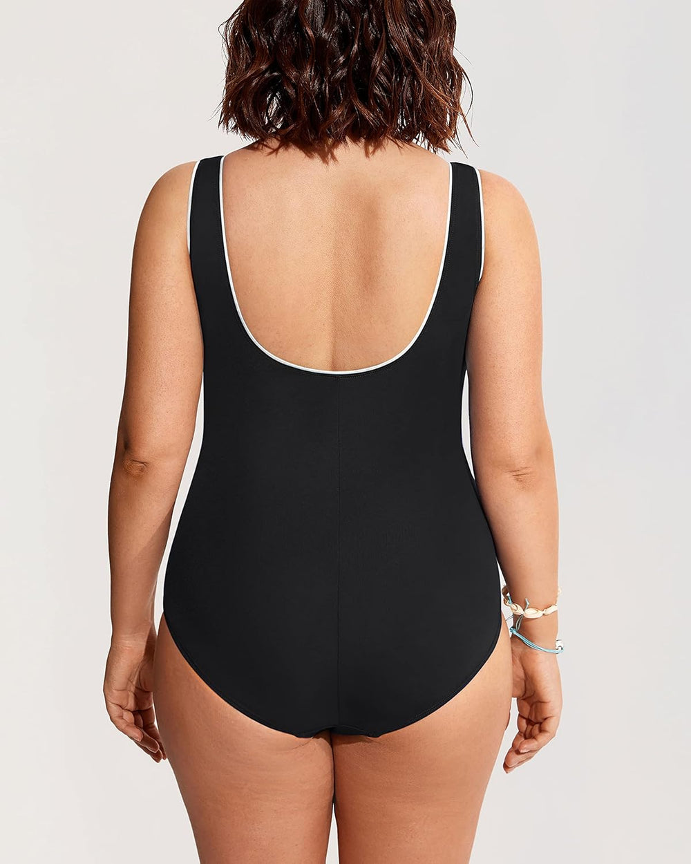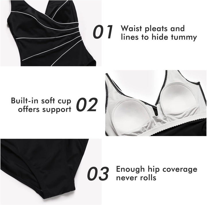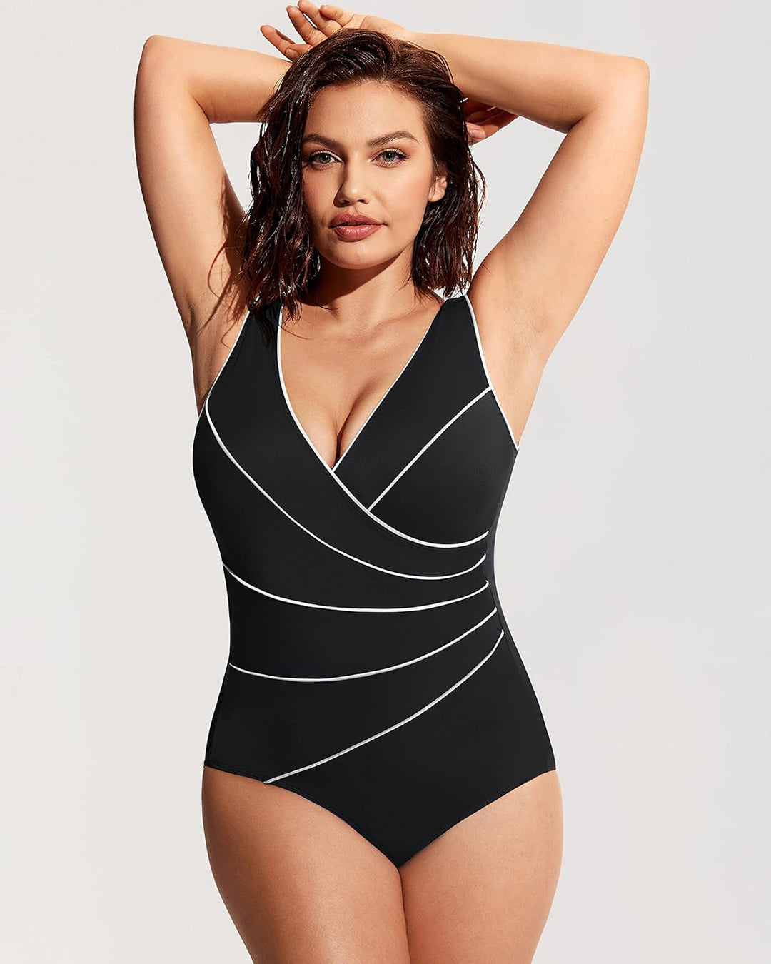 DELIMIRA Damen Badeanzug Bauchweg Grosse Grössen V Ausschnitt Gepolsterte Einteiler Bademode 52 Schw