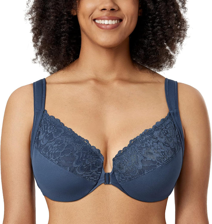 DELIMIRA Damen BH mit Vorderverschluss Bügel Spitzen BHS Grosse Brüste Soft Vollschalen Ungefüttert