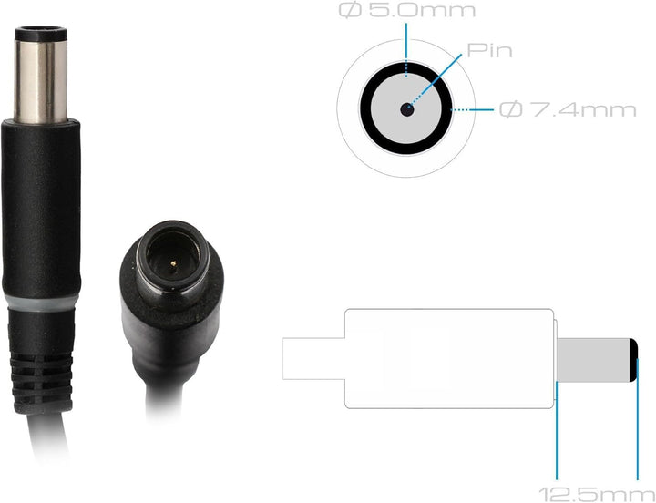 - Steckertyp: rund, Steckerform: 180° gerade, Aussendurchmesser des Steckers: 7,4 mm, Innendurchmesser des Steckers: 5,0 mm, Länge des Steckers: 12,5 mm, Stift im Stecker: Ja, Länge des Anschlusskabels vom Netzteil zum Notebook: ca. 1,75 m