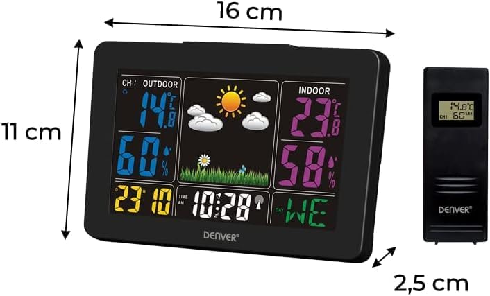 - Farbiges Display: Ein lebendiges Farbdisplay bietet klare und anschauliche Darstellungen von Wetterdaten, einschliesslich Temperatur, Luftfeuchtigkeit und Wettertrends