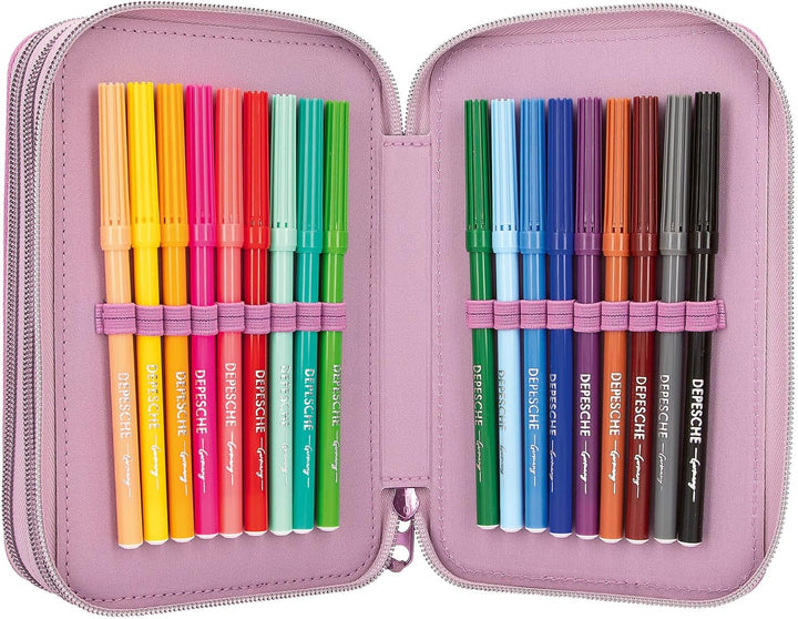 - Gefüllt mit je 18 Bunt- und Filzstiften, 2 Bleistiften, Radierer, Anspitzer, Lineal, Schere, Klebestift und einem kleinen Klett-Täschchen