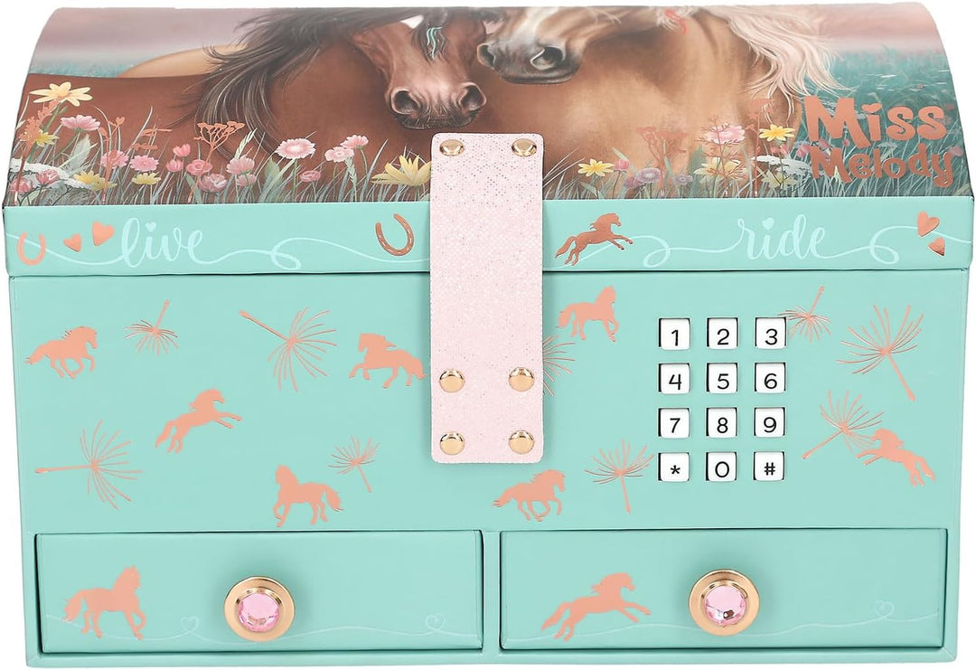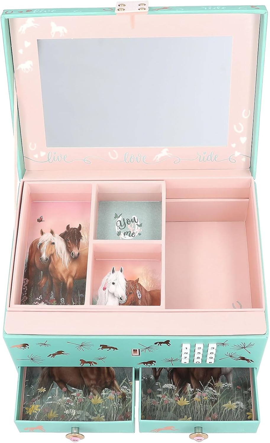 - Ausgestattet mit einem Klappdeckel, Spiegel, 2 kleinen Schubladen, ein herausnehmbares Inlay und ein weiteres Fach darunter für genügend Platz, um Ringe, Ketten und andere Schmuckstücke zu ordnen