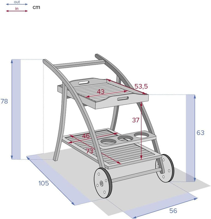 PRODUKTBESCHREIBUNGEN Servierwagen Tiwi von Hespéride, dem Spezialist für aussergewöhnliche Gärten. Die Tiwi Kollektion bietet Ihnen die komplette Ausstattung Ihrer Terrasse dank des Tischs, der Bank, der Lounge und dem Beistelltisch aus massivem Akazienholz. Servierwagen mit abnehmbarer Platte (57 x 46 x 7 cm) für einfaches Servieren Ausgestattet mit einem Flaschenhalter, damit sie während des Transports nicht herausfallen. 2 grosse Räder Zum Selbstaufbau. Naturfarben. Masse: 105 x 56 cm, Höhe: 78 cm. Gewicht: 11 kg.