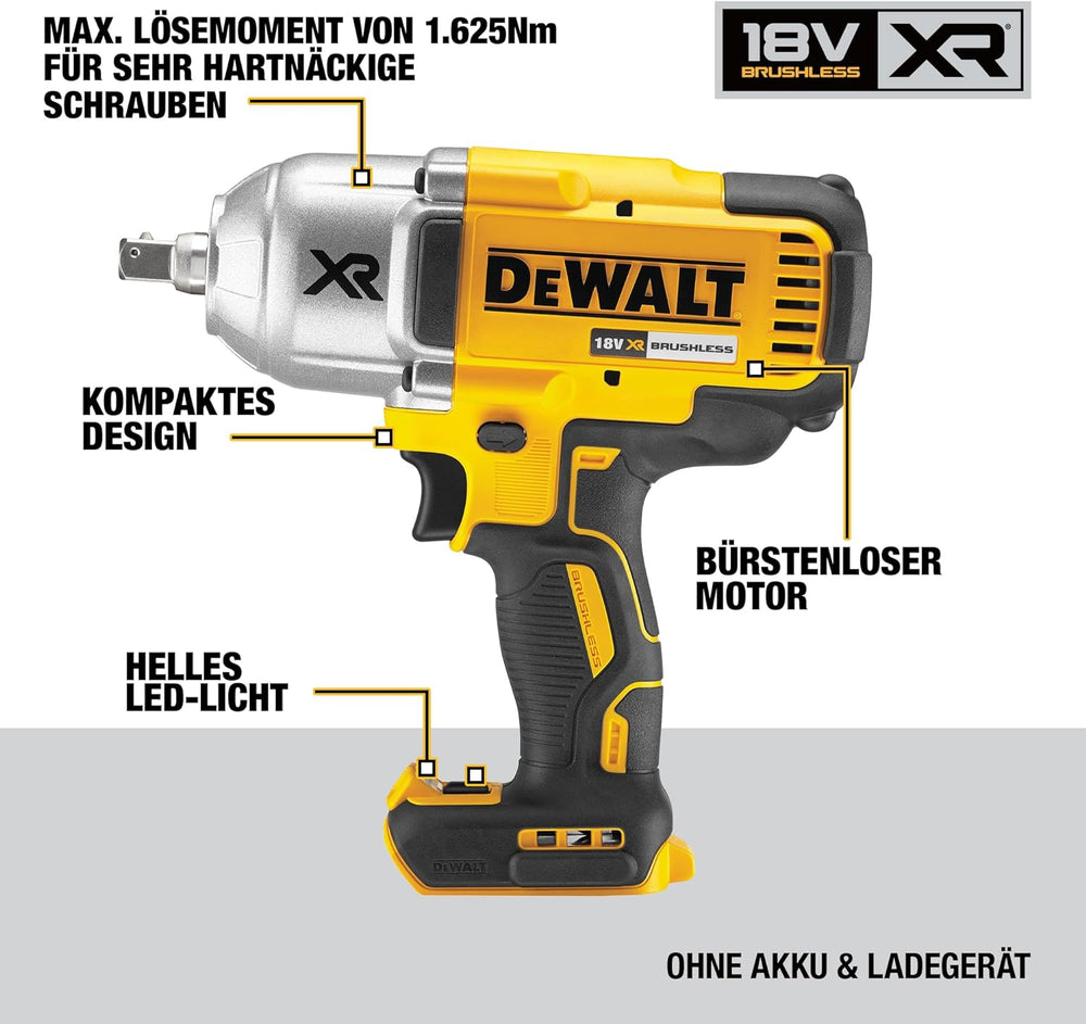 - Der kabellose DeWalt Schlagschrauber der XR-Serie ist durch den maximalen Drehmoment von 950 Nm besonders stark und eignet sich somit optimal für extrem schwere Schraubanwendungen