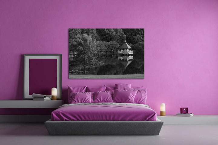 deyoli See im Park mit Holzpavillion Effekt: Schwarz/Weiss Format: 120x80 als Leinwand, Motiv fertig