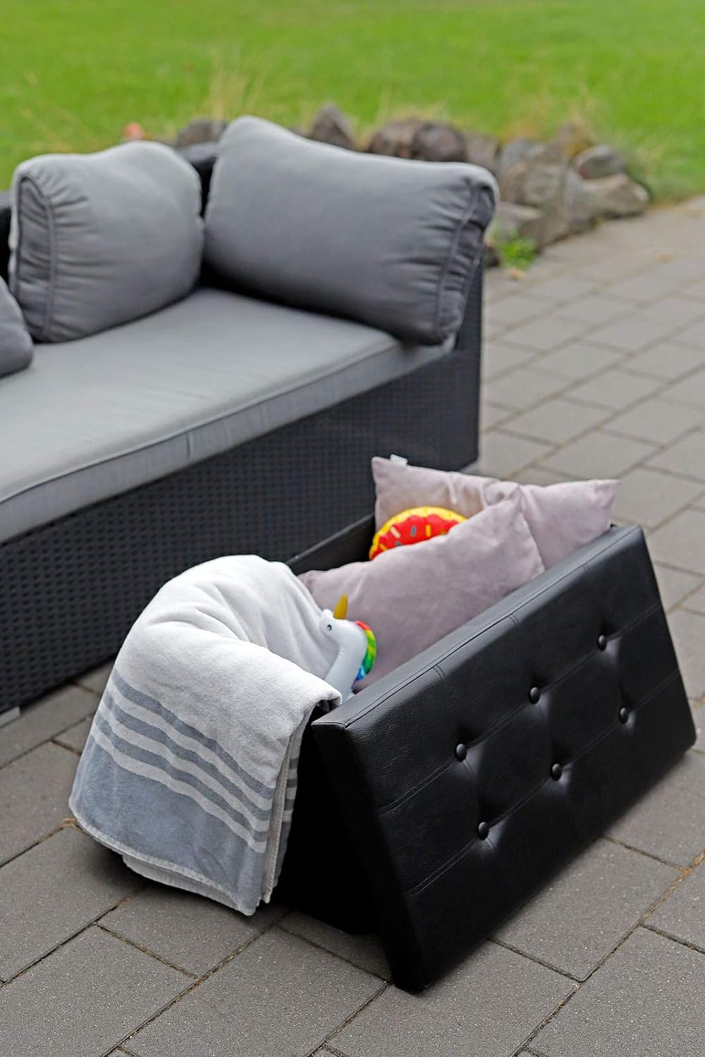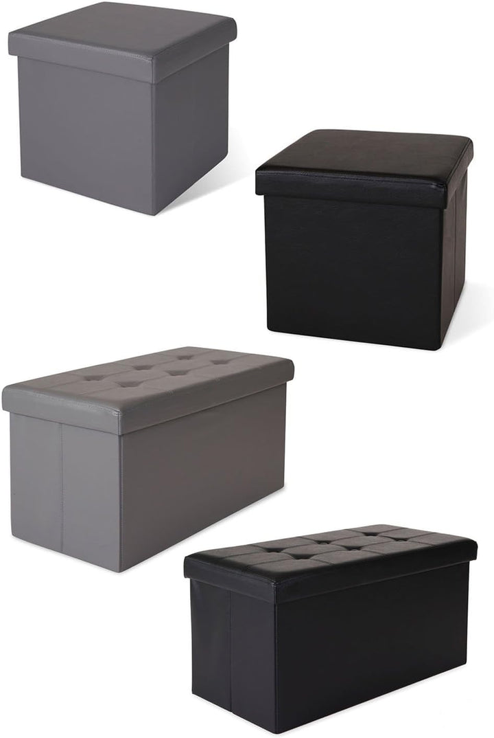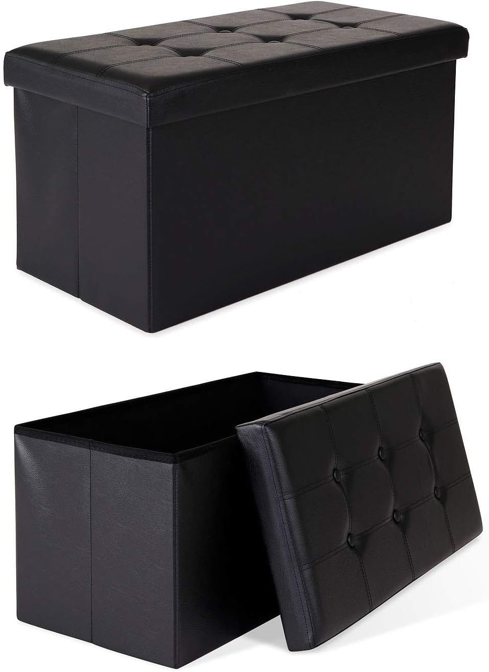 - Faltbare Sitzbank, ca. 76 x 38 x 38 cm, abnehmbarer Deckel, viel Stauraum (ca. 80 Liter), Bezug Lederimitat, Max-Belastung 300 kg