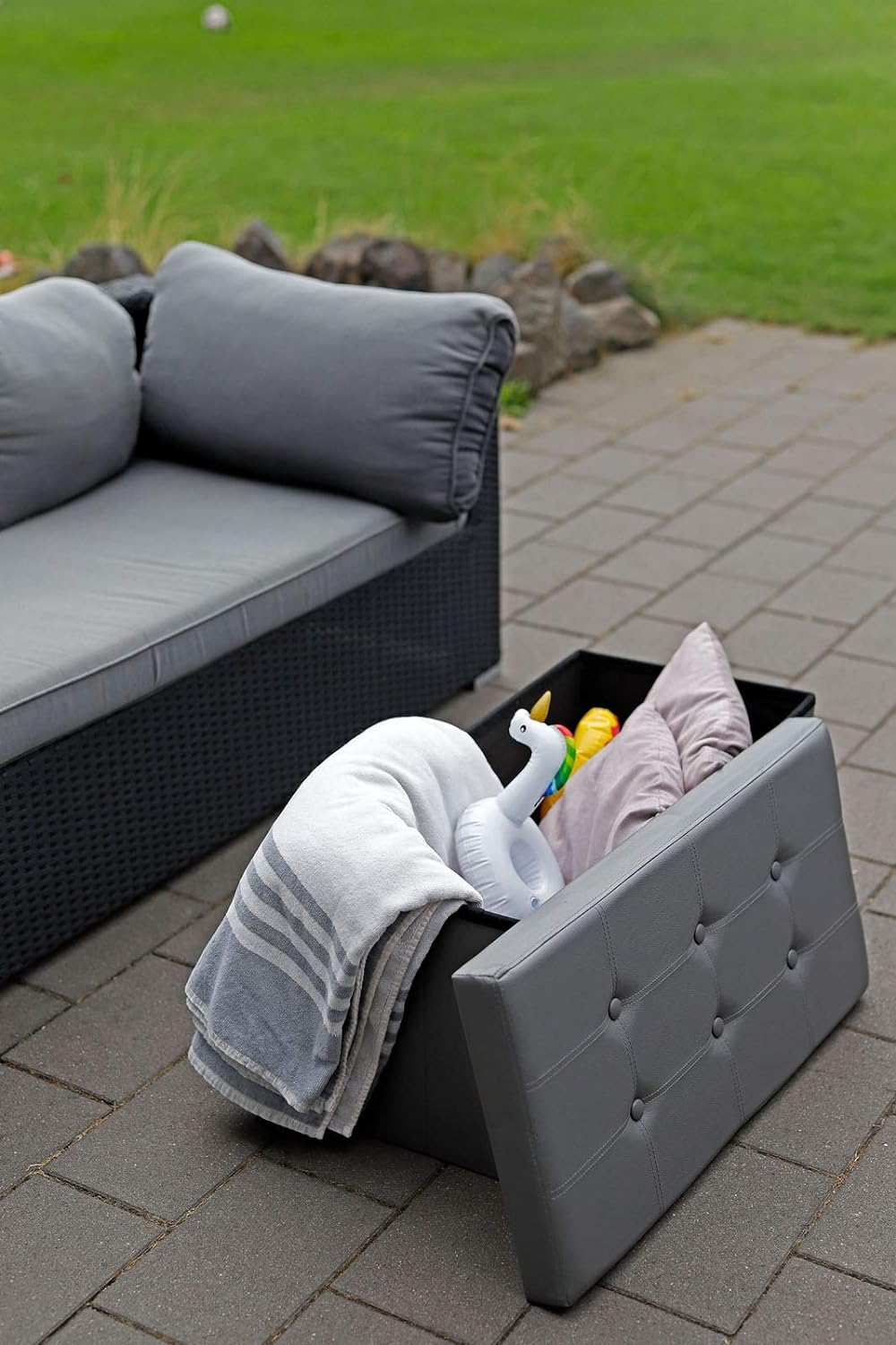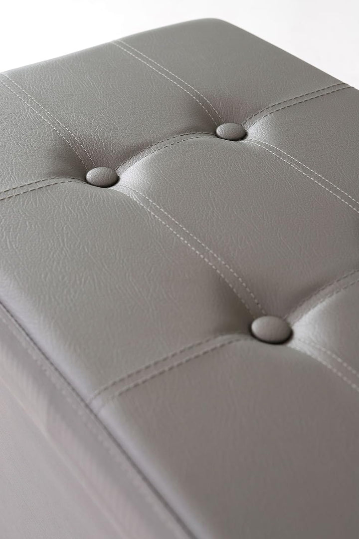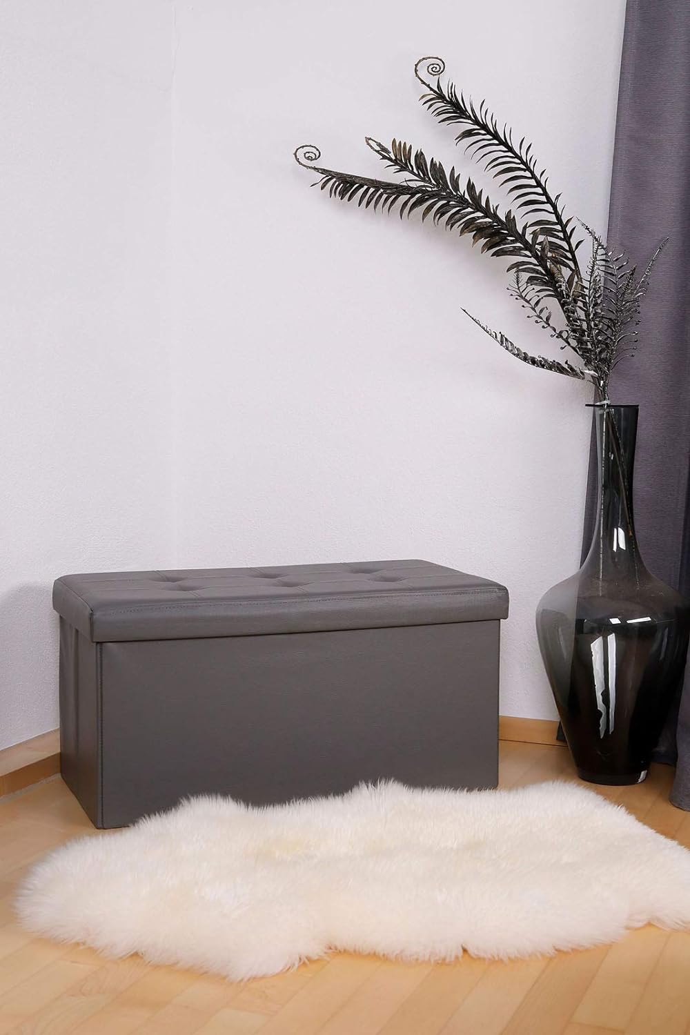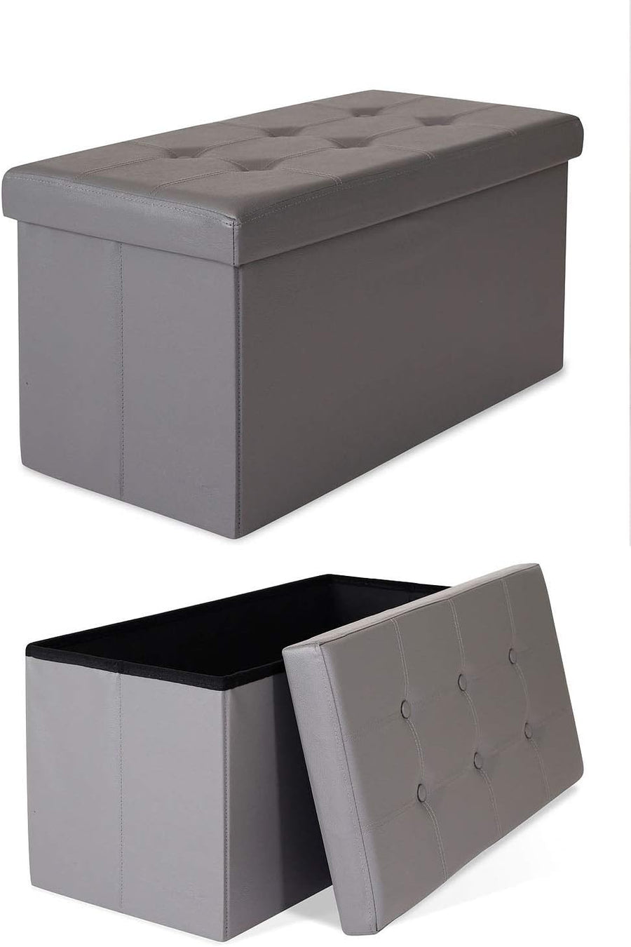 - Faltbare Sitzbank, ca. 76 x 38 x 38 cm, abnehmbarer Deckel, viel Stauraum (ca. 80 Liter), Bezug Lederimitat, Max-Belastung 300 kg