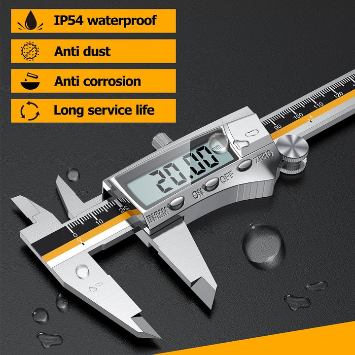 - Ausgezeichnete und hochwertige Konstruktion: Die digitalen Messschieber sind aus hochwertigem, gehärtetem Edelstahl gefertigt, der rostfrei und unempfindlich gegen Staub und Wasserspritzer aus allen Richtungen ist.