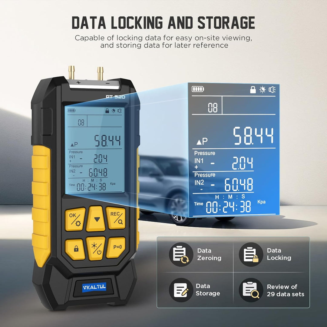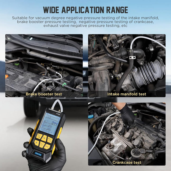 - ✅【Weiter Anwendungsbereich】PT520 Dual Input Differenzdruckmessgerät ist geeignet für Ansaugkrümmer Unterdruckprüfung, Bremskraftverstä rker Druckprüfung, Kurbelgehäuse Unterdruckprüfung, Auslassventil Unterdruckprüfung und so weiter.