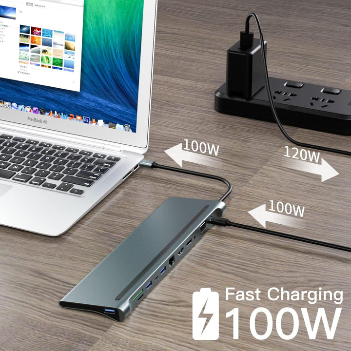 - 【100 W PD Power】 Schliessen Sie ein Netzteil mit mindestens 120 W über den PD-Anschluss an und verbinden Sie dann den Typ-C-Anschluss der Dockingstation mit Ihrem Laptop. Die Dockingstation kann Ihren Laptop mit einer maximalen Ladeleistung von 100