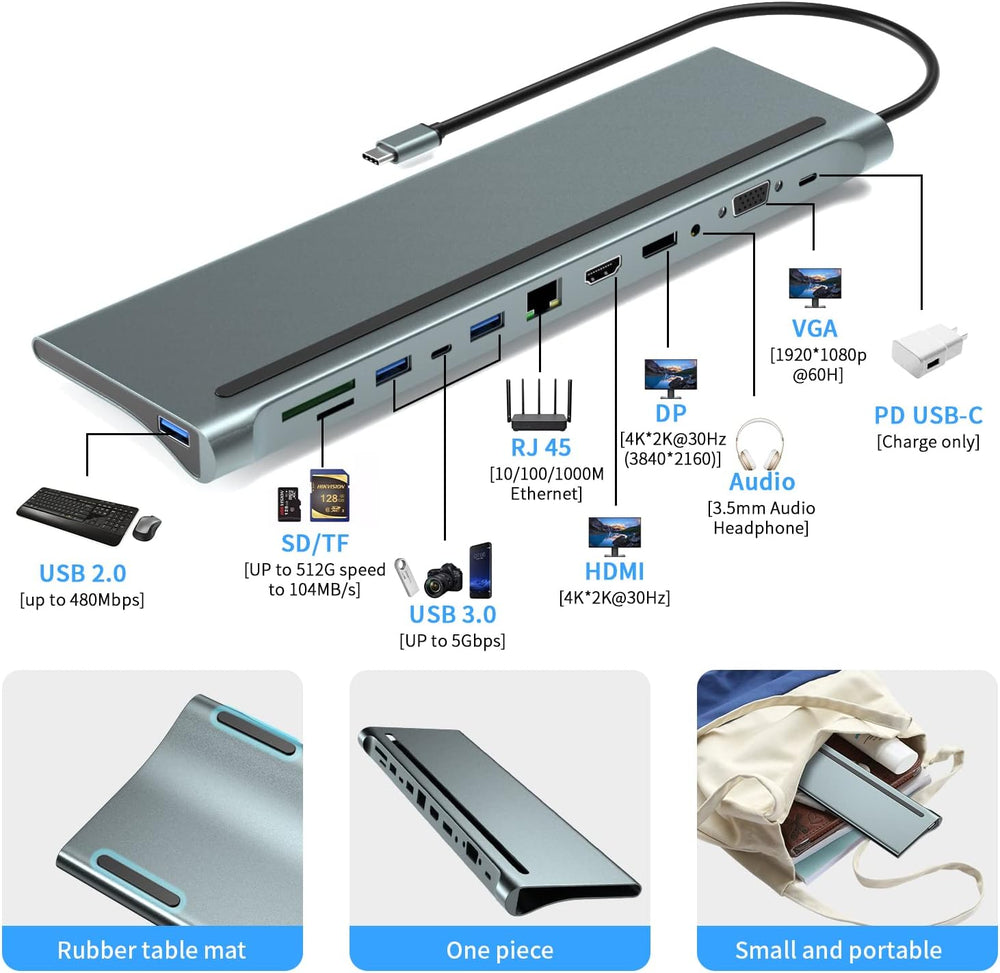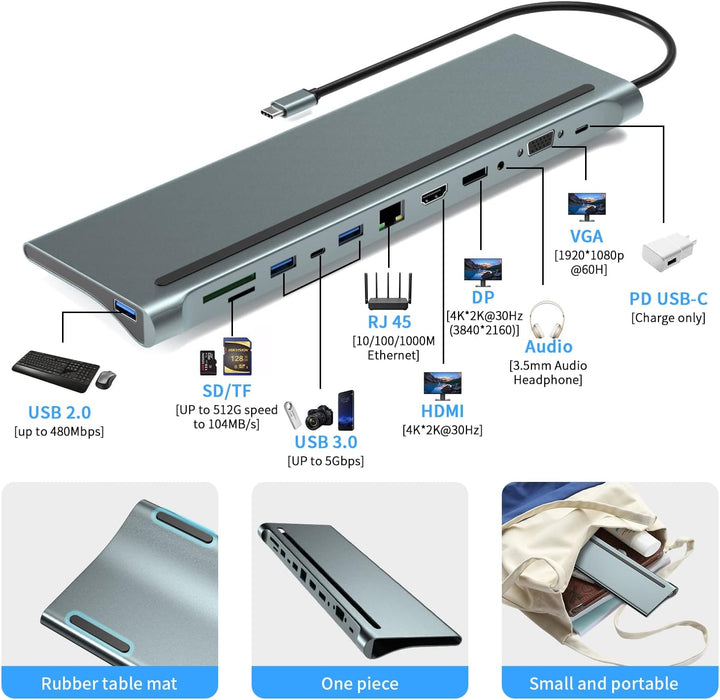 - 【12-in-1-USB-Dockingstation】 Dieser USB-C-Hub verfügt über DP, HDMI, VGA, Gigabit Ethernet, 3,5-mm-Stereo-Audioeingang und -ausgang, SD- und TF-Kartenleser, 4 USB 3.0 (Super Highspeed 5 Gbit/s) für Back-kompatibel, PD3 .0 USB-C wird zum Aufladen