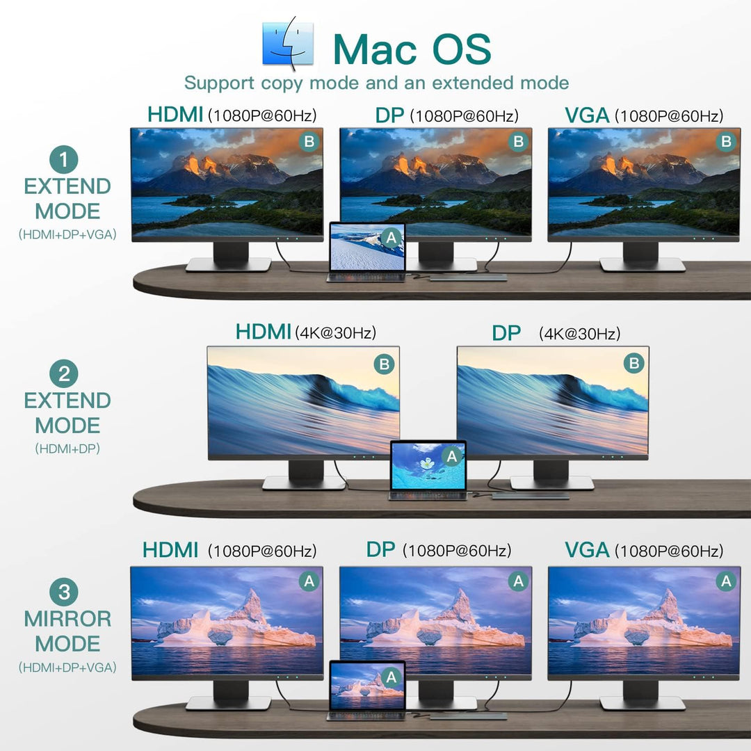 - 【WINDOWS drei Bildschirme】 Drei Bildschirme: HDMI+VGA+DP, aber nur das Windows-System unterstützt drei Bildschirme; das Mac-Betriebssystem wird nicht unterstützt. Streamen Sie 4K Ultra HD- oder Full HD 1080P-Videos für ein filmähnliches Gefühl.