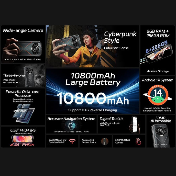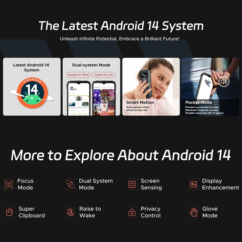 - 【GPU Mali-G57 und Android 14】 Das robuste Telefon Doogee S Cyber wird durch einen Herstellungsprozess der Klasse 12 nm, Octa-Core Mali-G57 GPU verarbeitet. Das Cyber DOOGEE S-Telefon läuft auf Android 14 und gewährleistet einen reibungslosen und