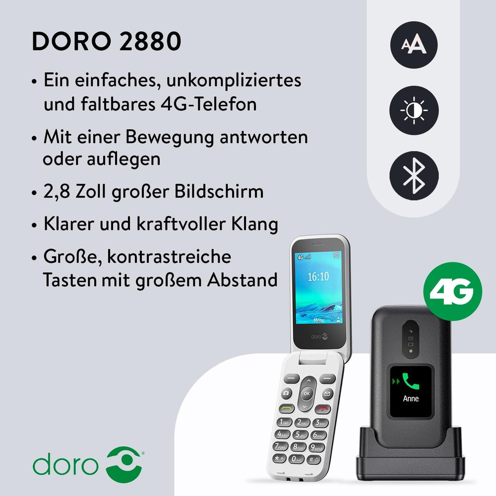 - Unterstützungstaste: Wenn Sie Hilfe benötigen, halten Sie die Assistenztaste auf der Rückseite des Doro 2880 gedrückt. Eine SMS und ein Support-Anruf werden automatisch an Ihre konfigurierten Kontakte gesendet.