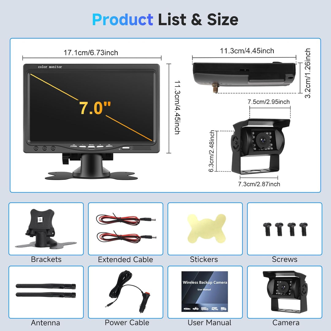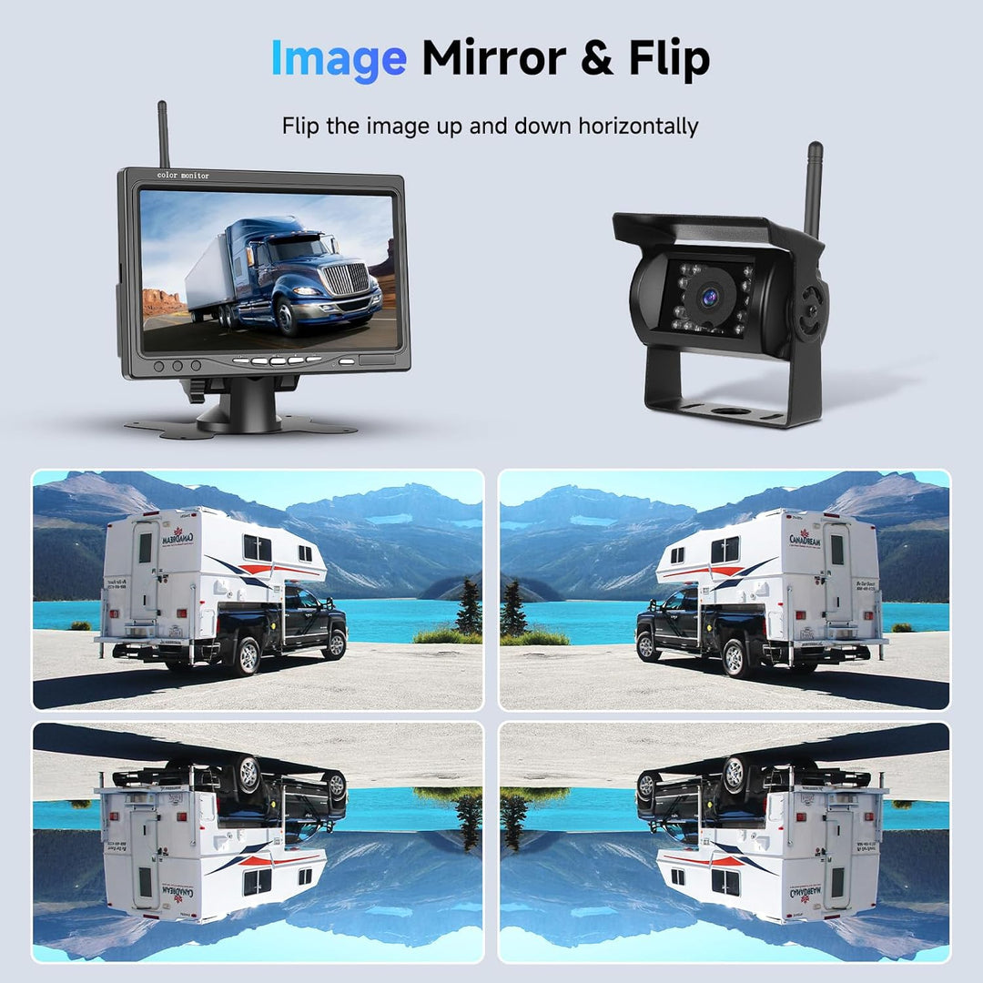 - Verbesserte Easy Setup Wireless Backup Kamera und Monitor Kit für Auto RV LKW Bus Caravan Bus Wohnmobil, integrierte Wireless Reverse Kamera und 7 "TFT LCD Rückansicht Monitor, Unterstützung 12V-24V Power System.