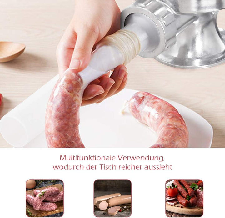 - Praktischer Helfer – Dieser Wurstfüller gilt als ein guter Helfer bei Bearbeitung der Wurst. Mit einer Tischklemmer kann dieser Wurstfüller an jedem flachen Tisch befestigt werden, deswegen ist es beim Kochen rutschfest und angenehm. Dieser Wurstfüller ist für die Restaurant, zu Hause und Fleischtheke sehr geeignet.