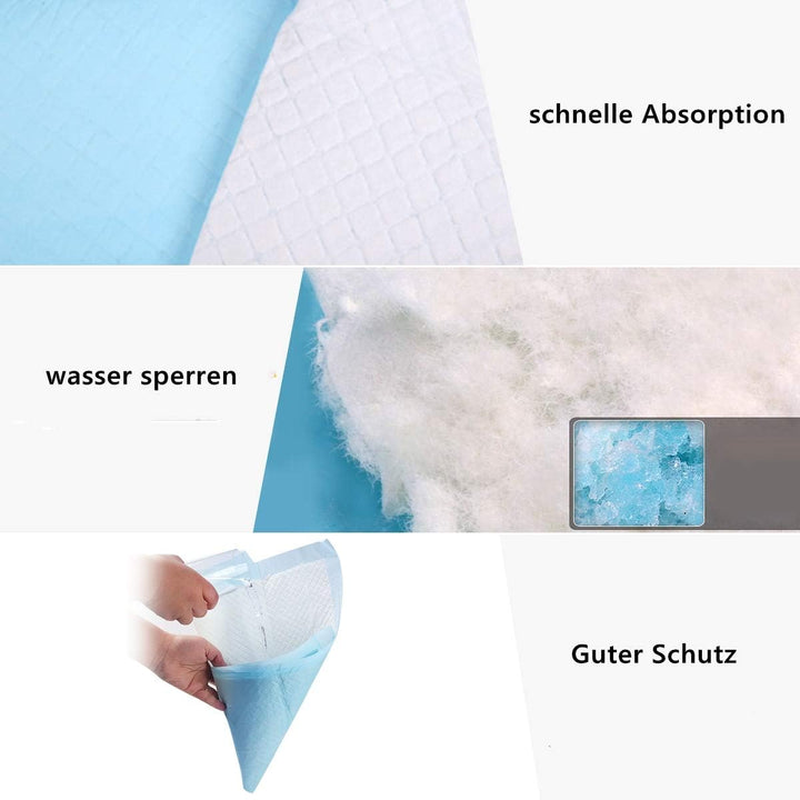 • 🐕 Vielfältig einsetzbar - Diese Puppy Pads kann man nicht nur zu Hause einsetzen, sondern auch in der Hundehütte und im Auto. Beim Gassi gehen kann man sie auch mitbringen. Nach dem Gebrauch gehört sie in den Mülleimer.