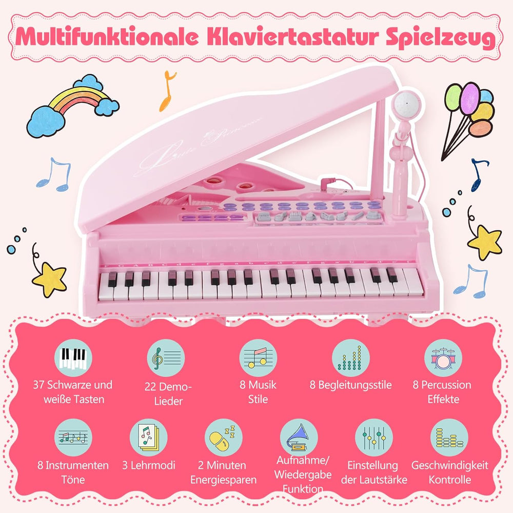 - 🎵Multifunktionales 37-Tasten-Klavier für Kinder - Dieses Spielzeugklavier ist mit 37 Tasten, 22 Demo-Liedern, 8 Rhythmen, 8 Begleitungsstilen, 8 Percussion-Effekten, 8 Instrumententönen, 2 Minuten Stromsparfunktion, Aufnahme- und