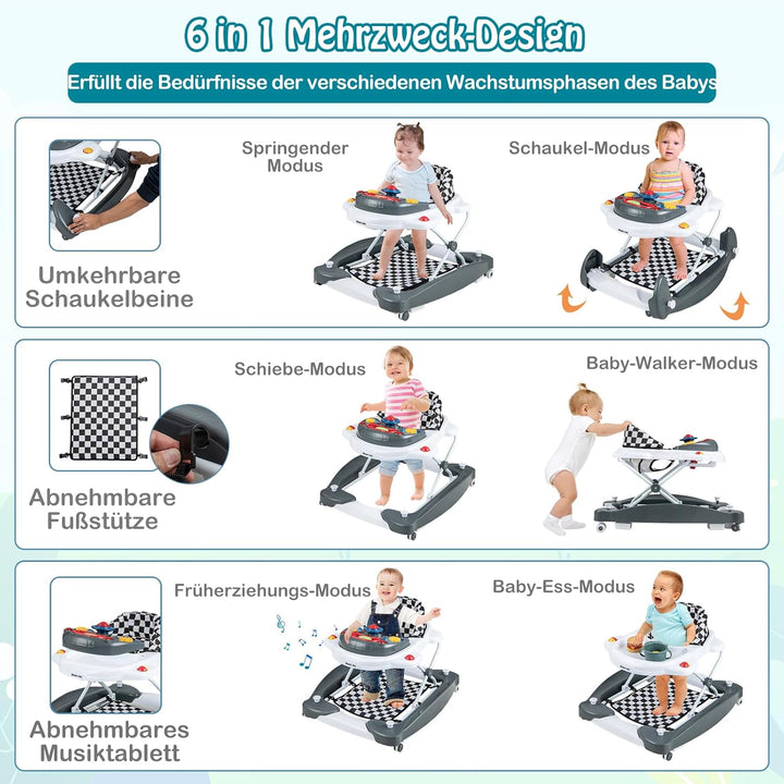 - Vielseitige 6-in-1 Funktionalität - Das multifunktionale Aktivitätszentrum bietet 6 verschiedene Modi, darunter Schaukel, Jumper, Walker, Schiebewagen, frühkindliche Bildung und Essmodus, um die verschiedenen Bedürfnisse Ihres Kindes zu erfüllen und