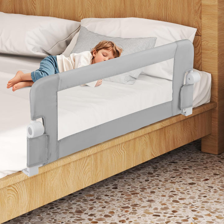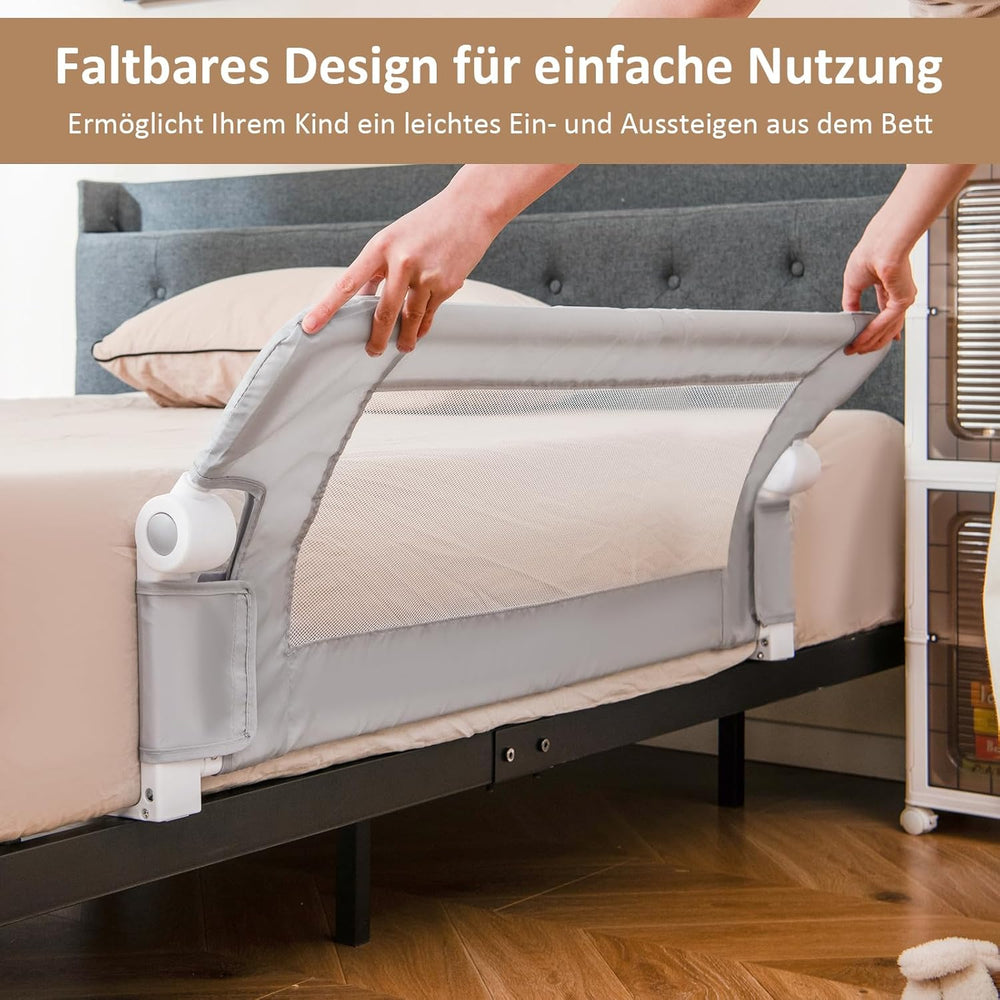 - Klappbar und tragbar – Durch den gleichzeitigen Druck auf die Knöpfe ist das Bettgitter klappbar. Und das Design von der Doppeldruckknopf kann dabei helfen, die Öffnung von Kindern selbst zu vermeiden. Wegen der Faltbarkeit und des Leichtgewichts