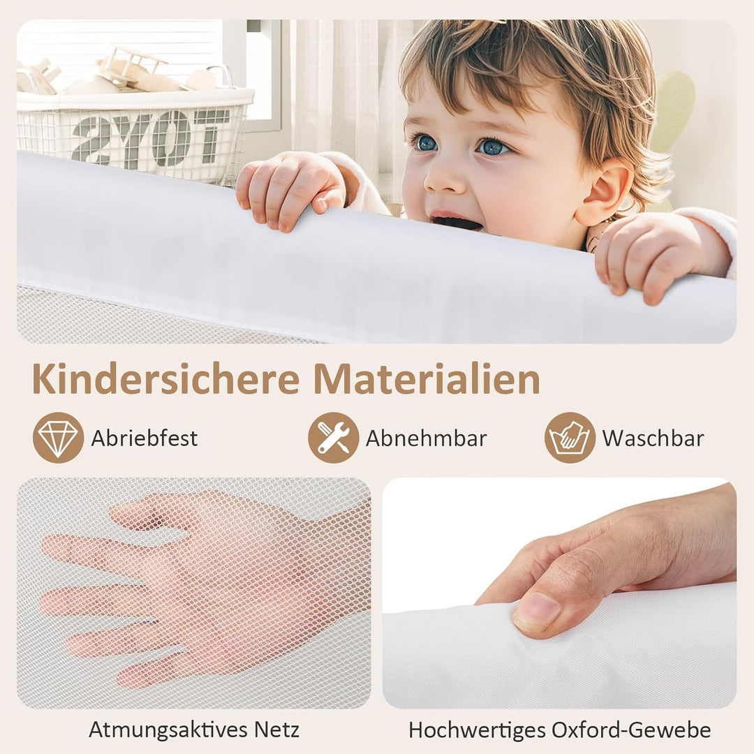 - Luftdurchlässige und sichere Stoffe – Unser Bettgitter ist aus Oxford Gewebe gefertigt, die atmungsaktiv und langlebig ist. Ausserdem verursacht der Stoff die Missempfindung von der Haut nicht. Und das Gitter ist ringsum von weicher PP Watte gefüllt,