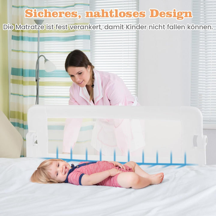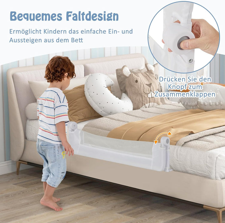 - Klappbar und tragbar – Durch den gleichzeitigen Druck auf die Knöpfe ist das Bettgitter klappbar. Und das Design von der Doppeldruckknopf kann dabei helfen, die Öffnung von Kindern selbst zu vermeiden. Wegen der Faltbarkeit und des Leichtgewichts