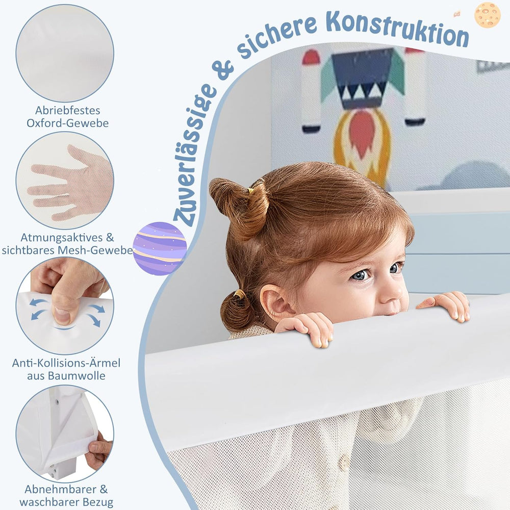 - Luftdurchlässige und sichere Stoffe – Unser Bettgitter ist aus Oxford Gewebe gefertigt, die atmungsaktiv und langlebig ist. Ausserdem verursacht der Stoff die Missempfindung von der Haut nicht. Und das Gitter ist ringsum von weicher PP Watte gefüllt,