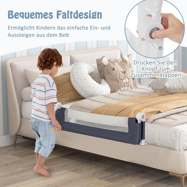- Klappbar und tragbar – Durch den gleichzeitigen Druck auf die Knöpfe ist das Bettgitter klappbar. Und das Design von der Doppeldruckknopf kann dabei helfen, die Öffnung von Kindern selbst zu vermeiden. Wegen der Faltbarkeit und des Leichtgewichts