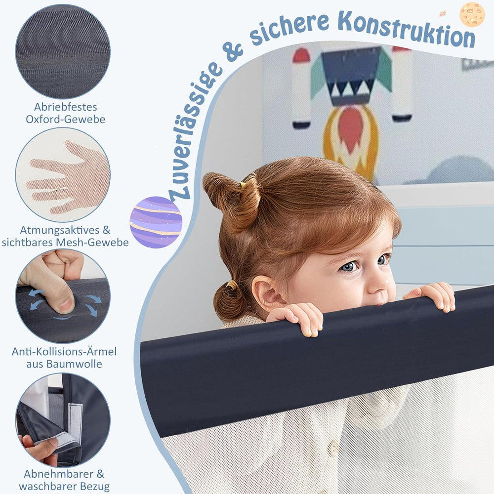 - Luftdurchlässige und sichere Stoffe – Unser Bettgitter ist aus Oxford Gewebe gefertigt, die atmungsaktiv und langlebig ist. Ausserdem verursacht der Stoff die Missempfindung von der Haut nicht. Und das Gitter ist ringsum von weicher PP Watte gefüllt,