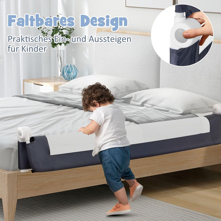 - Klappbar und tragbar – Durch den gleichzeitigen Druck auf die Knöpfe ist das Bettgitter klappbar. Und das Design von der Doppeldruckknopf kann dabei helfen, die Öffnung von Kindern selbst zu vermeiden. Wegen der Faltbarkeit und des Leichtgewichts