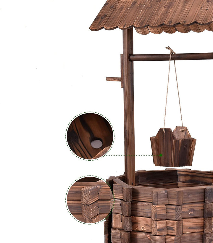 - Karbonisierung für Gute Wetterbeständigkeit - Die Oberfläche des Tannenholz ist karbonisiert, damit der Dekobrunnen eine gute Wasserbeständigkeit aufweist und sich an verschiedene Jahreszeiten anpassen kann. Dazu hat der Brunnen dadurch eine gute Stabilität und Verschleissfestigkeit und ist sehr pflegeleicht.