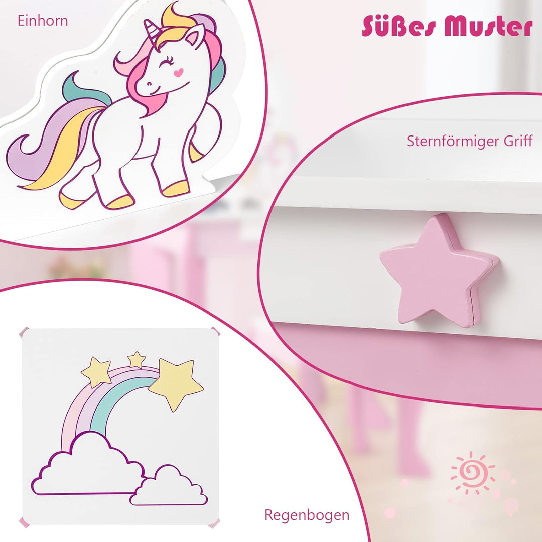 - 🦄 Wunderschönes Kindermöbel - Der Schminktisch mit geschwungenen Beinen und süssem Muster ist ein toller Hingucker im Kinderzimmer und zieht die Aufmerksamkeit von kleinen Mädchen sofort auf sich. Dank des verträumten Designs fühlen sie sich die