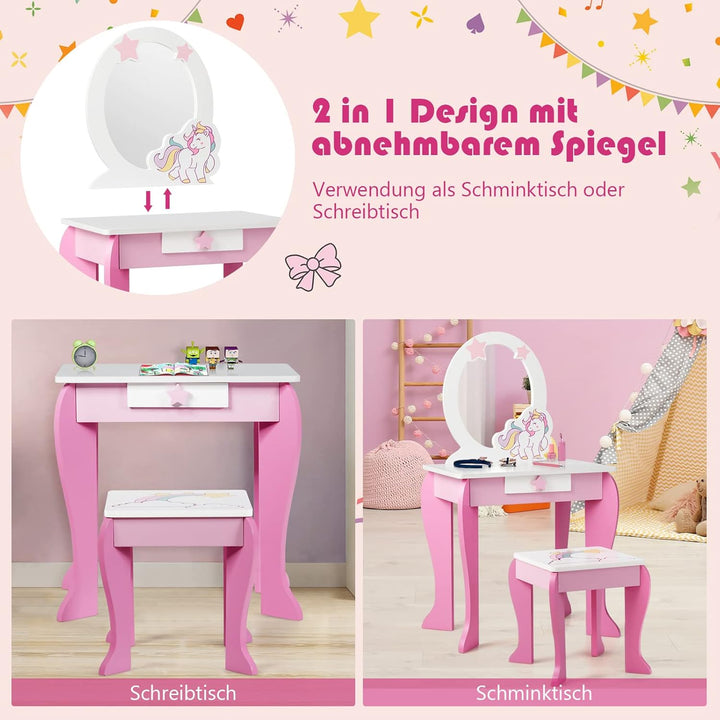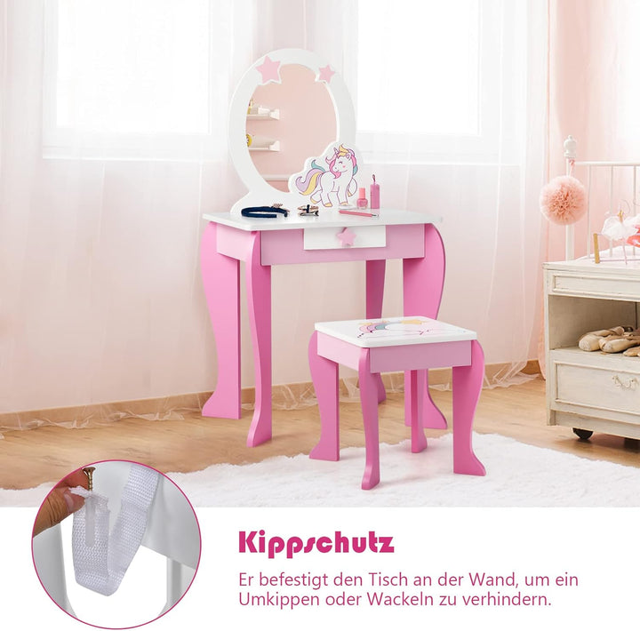 - 🦄 Sicher für Kinder - Wir legen grossen Wert auf die Sicherheit und Gesundheit von Kindern. Alle verwendeten Materialien sind hochwertig, geruchlos und gesundheitlich unbedenklich. Darüber hinaus wurde der Schminktisch abgerundet und es gibt keine