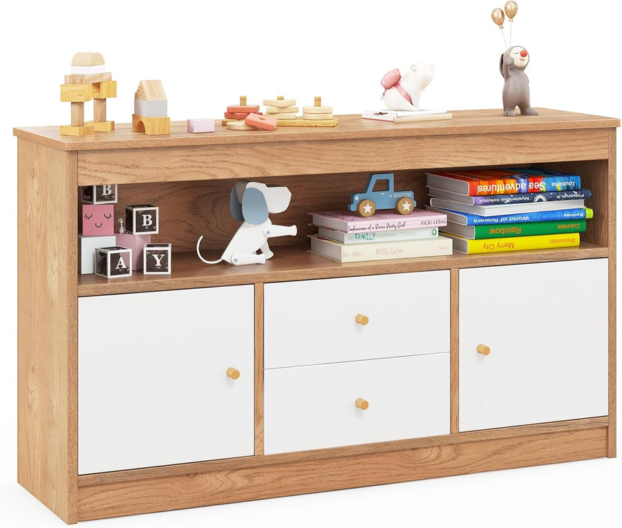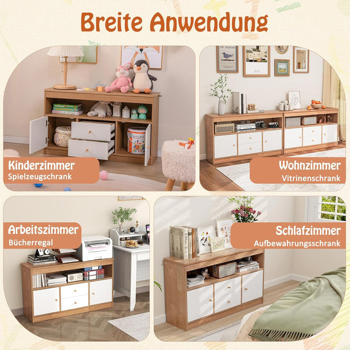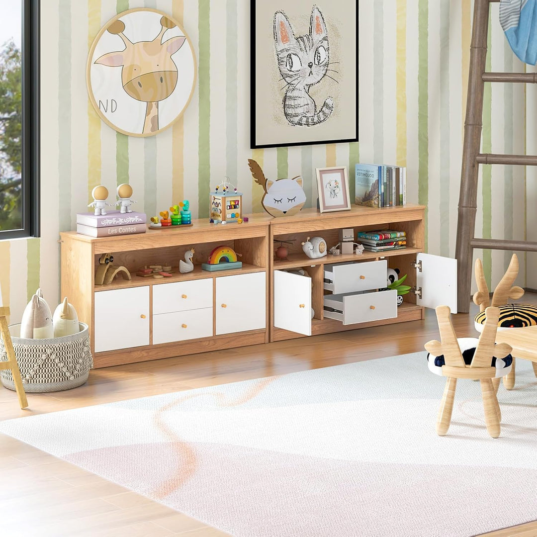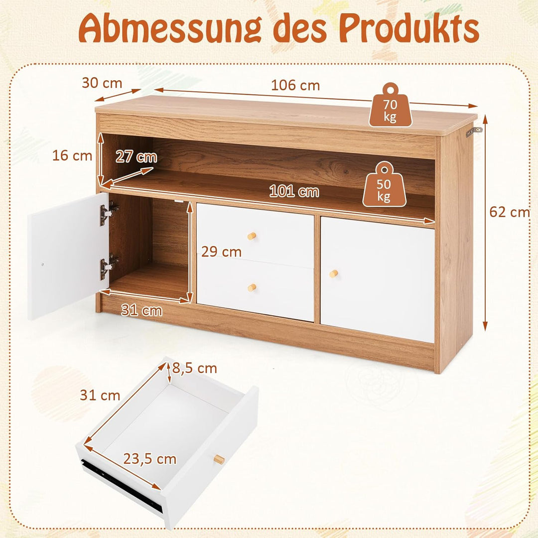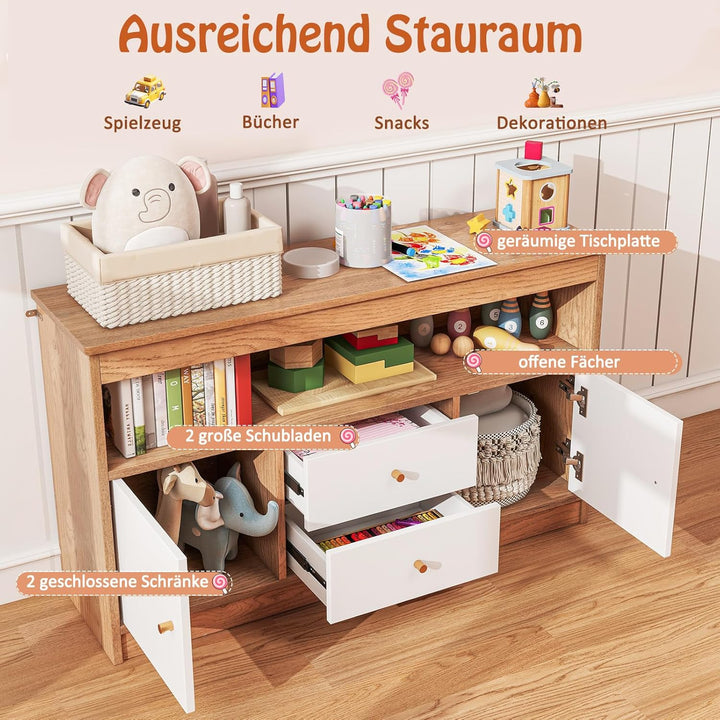 - 🧸 Viel Stauraum - Dieses Bücherregal bietet vielfältige Aufbewahrungsmöglichkeiten mit einer geräumigen Tischplatte, einem offenen Fach, 2 einflügeligen Schränken und 2 ausziehbaren Schubladen. Ideal zum Organisieren von Büchern, Spielzeug,