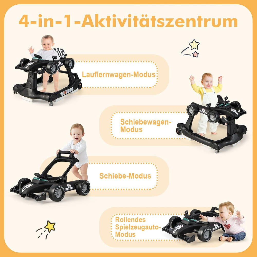 - 🚗 4 in 1 - Unsere Gehhilfe verfügt über vier Modi: Lauflernmodus und Push-Behind-Modus, Push-Car-Modus, Rollender Spielzeugauto-Modus. Daher ist diese 4 in 1 Lauflernhilfe für Baby von 6 bis 18 Monaten geeignet.