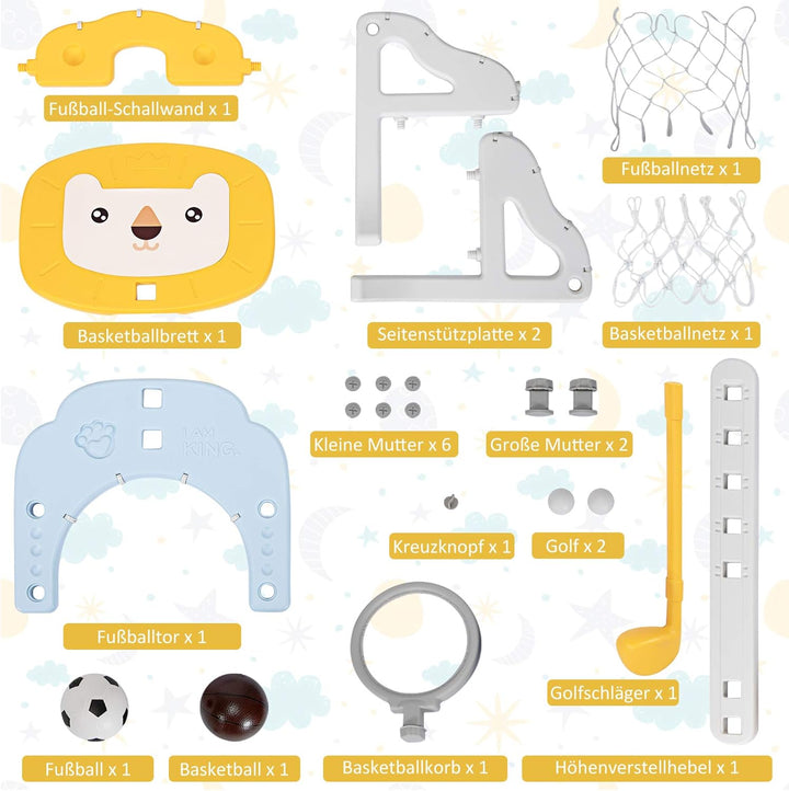 - 🏀 3 in 1 Spielset - Das Basketballständer-Set für Kinder vereinigt Basketballständer mit Korb, Fussballtore und Golf in sich, was Kindern mehr Spass macht. Es ist ein geniales Spiel für die Familie und bietet die Möglichkeit, Kinder und Eltern