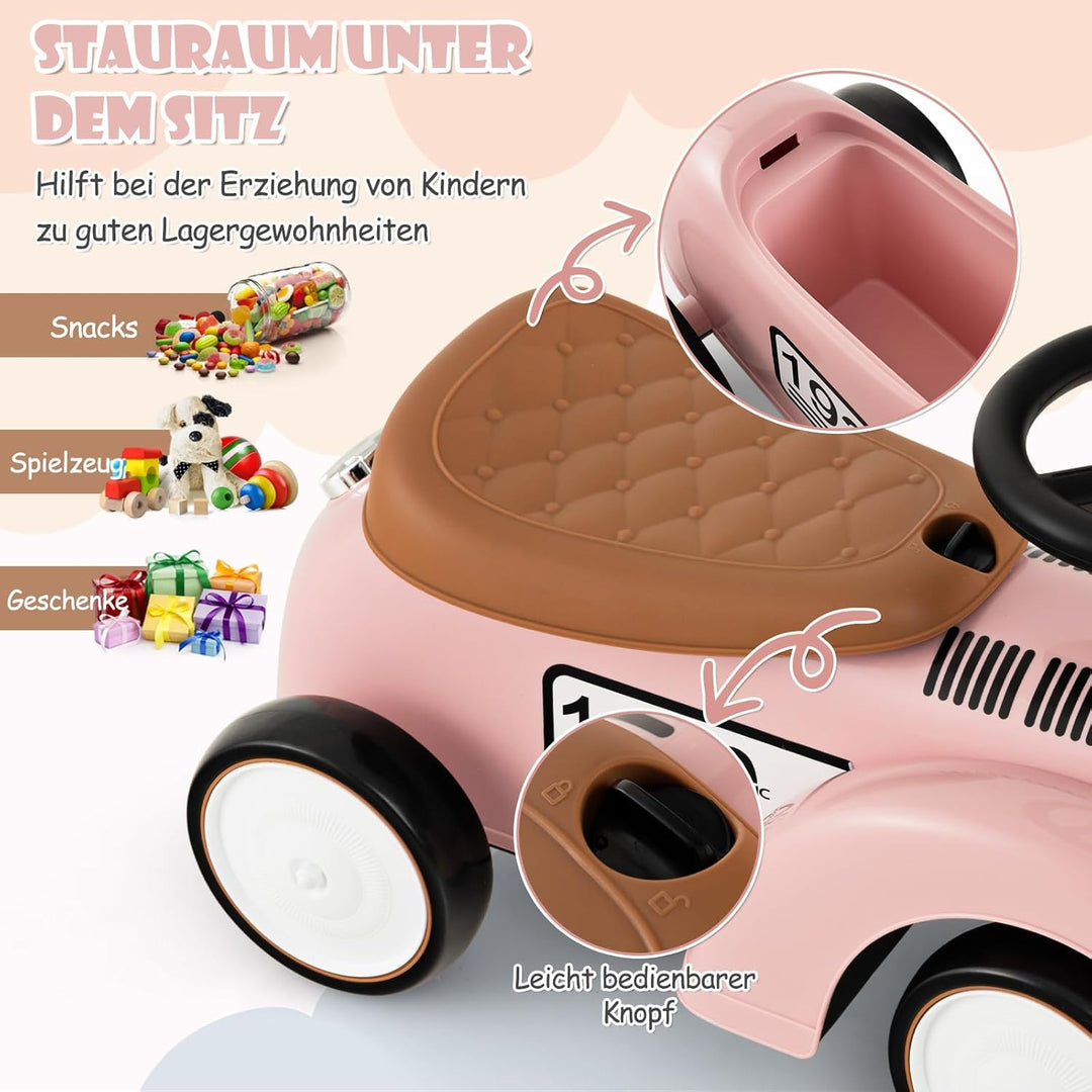 - 🏁Stauraum unter dem Sitz - Dank des geräumigen Stauraums unter dem Sitz dieses Retro-Rutschauto sind die Sachen Ihrer Kleinen immer in Reichweite.