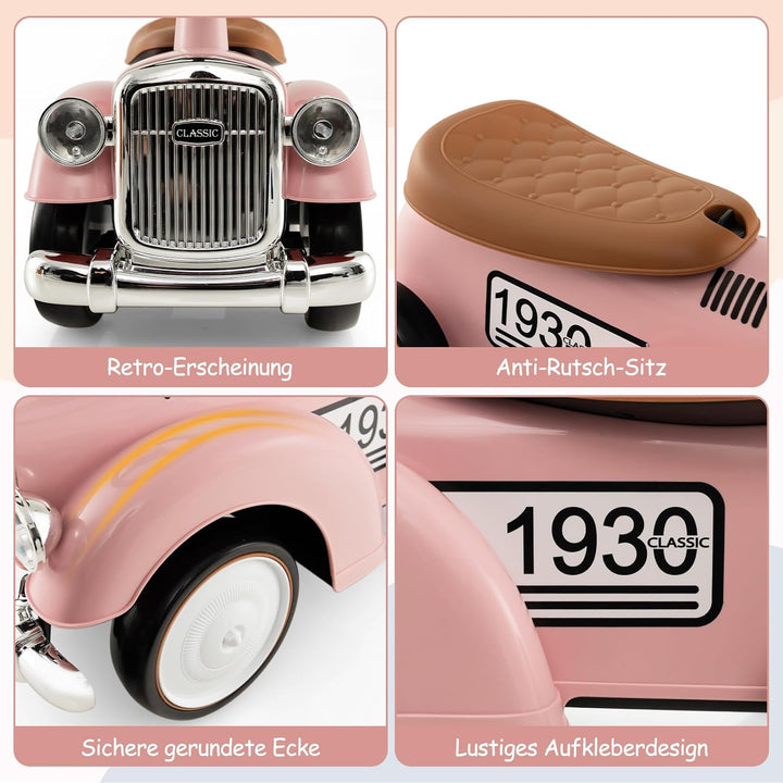 - 🏁Retro-Optik & Sicheres Design - Mit seinem charmanten Retro-Stil und dem lustigen Aufkleber-Design wird dieses Rutschauto die Fantasie Ihres Kindes mit Sicherheit anregen. Die Drucklufthupe mit piepsenden Soundeffekten bietet endlosen Spass.