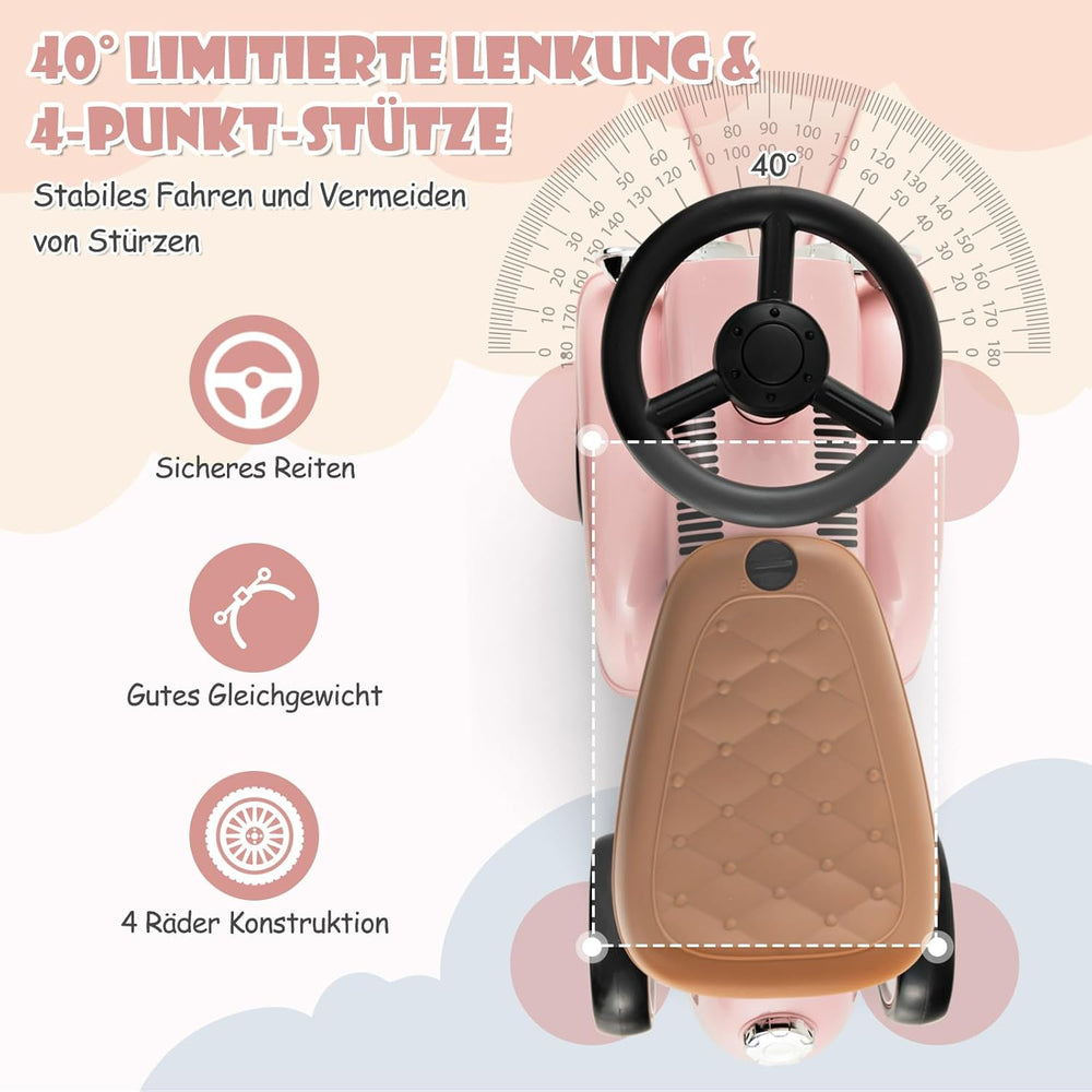 - 🏁40° Begrenzte Lenkung & 4-Punkt-Stütze - Dieses Rutschfahrzeug verfügt über eine 40° begrenzte Lenkung, die hilft, stabil zu fahren und ein Herunterfallen zu vermeiden. Ausserdem sorgt die 4-Rad-Konstruktion für gutes Gleichgewicht und sicheres