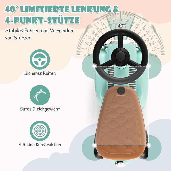 • 🏁40° Begrenzte Lenkung & 4-Punkt-Stütze - Dieses Rutschfahrzeug verfügt über eine 40° begrenzte Lenkung, die hilft, stabil zu fahren und ein Herunterfallen zu vermeiden. Ausserdem sorgt die 4-Rad-Konstruktion für gutes Gleichgewicht und sicheres