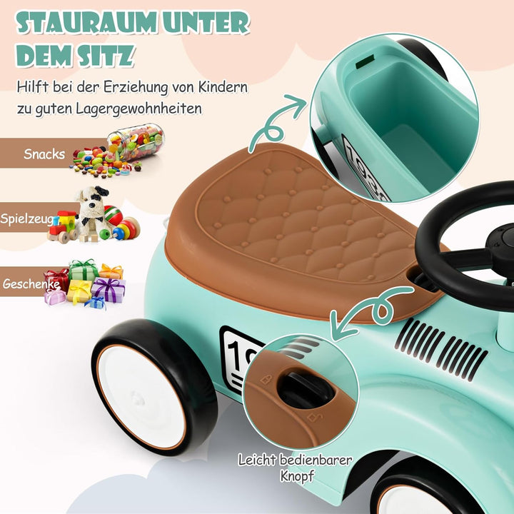 • 🏁Stauraum unter dem Sitz - Dank des geräumigen Stauraums unter dem Sitz dieses Retro-Rutschauto sind die Sachen Ihrer Kleinen immer in Reichweite.