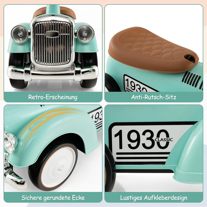 • 🏁Retro-Optik & Sicheres Design - Mit seinem charmanten Retro-Stil und dem lustigen Aufkleber-Design wird dieses Rutschauto die Fantasie Ihres Kindes mit Sicherheit anregen. Die Drucklufthupe mit piepsenden Soundeffekten bietet endlosen Spass.