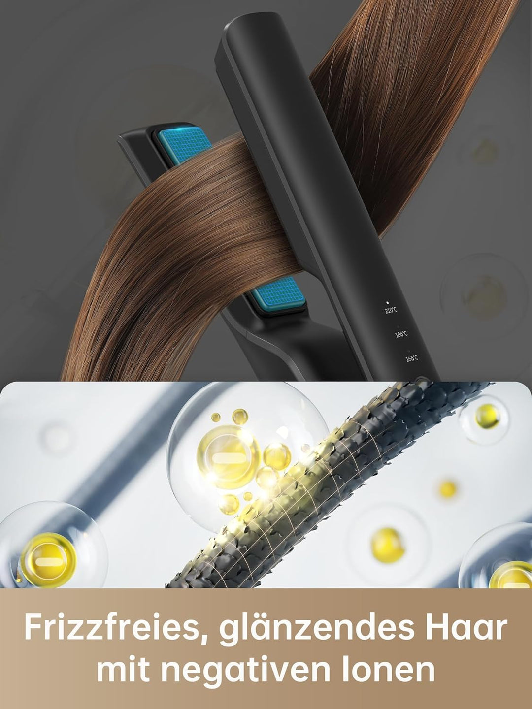 - Eingebaute Emitter erzeugt negative Ionen, schützt Ihr Haar und bewahrt vor Kräuseln. Eine Turmalinplatte reduziert Haarschäden und minimiert das Ziehen, so dass Ihr Haar gesund und glänzend aussieht.