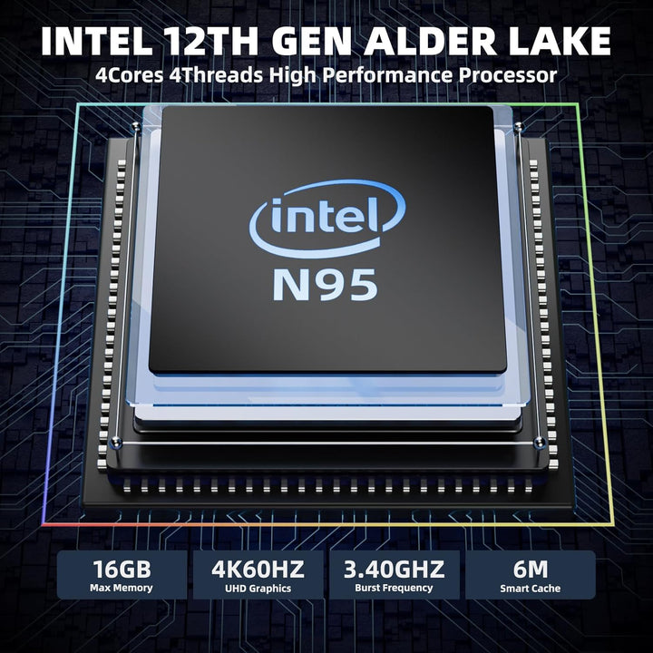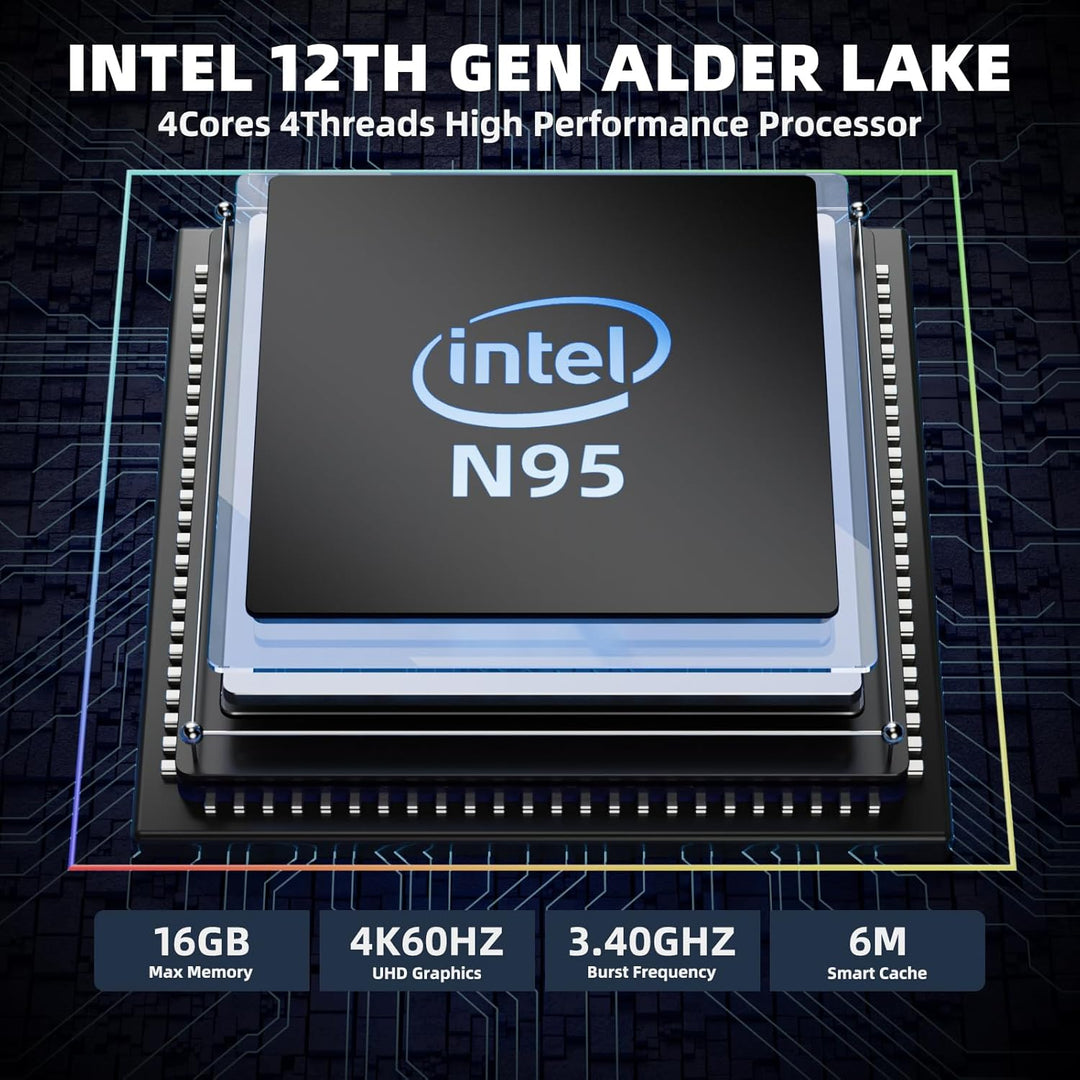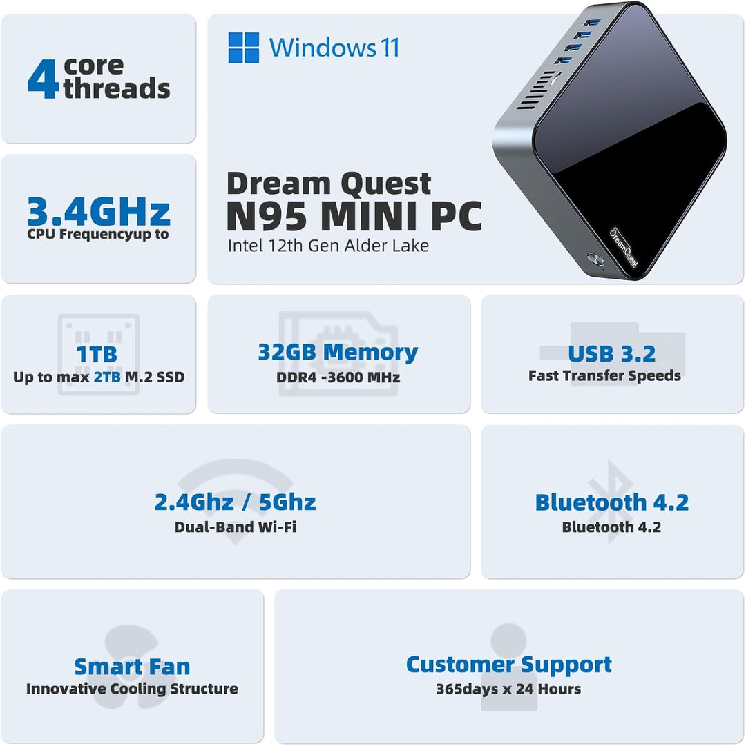 - DreamQuest Mini Pc Intel Alder Lake N95 der 12. Generation – Neuester Intel Alder Lake N95-Prozessor der 12. Generation (bis zu 3,4 GHz) Im Vergleich zu Intel (N100/N5105/N5100/N5095) ist die CPU-Leistung des N95 um 35 % und die GPU um 78 % verbessert
