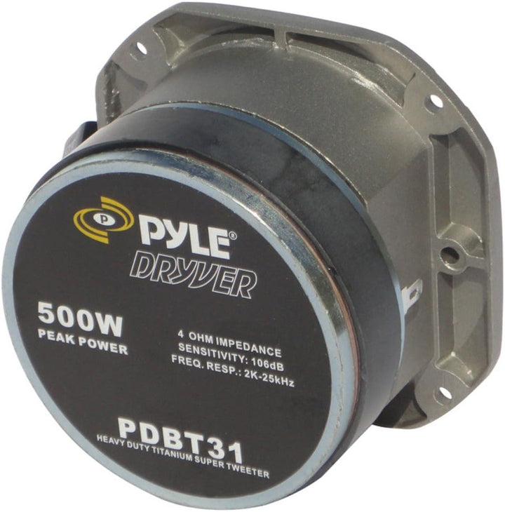 - Tweeter Pyle model pdbt31 zum titan; Schicht farben silber; Bewegliche spule zu hoher temperatur von 3,75 cm des diameter (1,5"); Struktur der membrane: aluminium; Kraft rms: 250 watt; Kraft max: 500 watt; Impedanz: 4 ohm; Sensibilität: 106 db; Geantwortet in frequenz: 2000 - 25000 hz